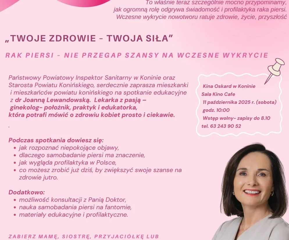 Koniński sanepid zaprasza na wykład Twoje zdrowie -Twoja siła. Ten, związany jest z trwającym miesiącem walki z rakiem piersi. Szczegółów szukajcie w internecie