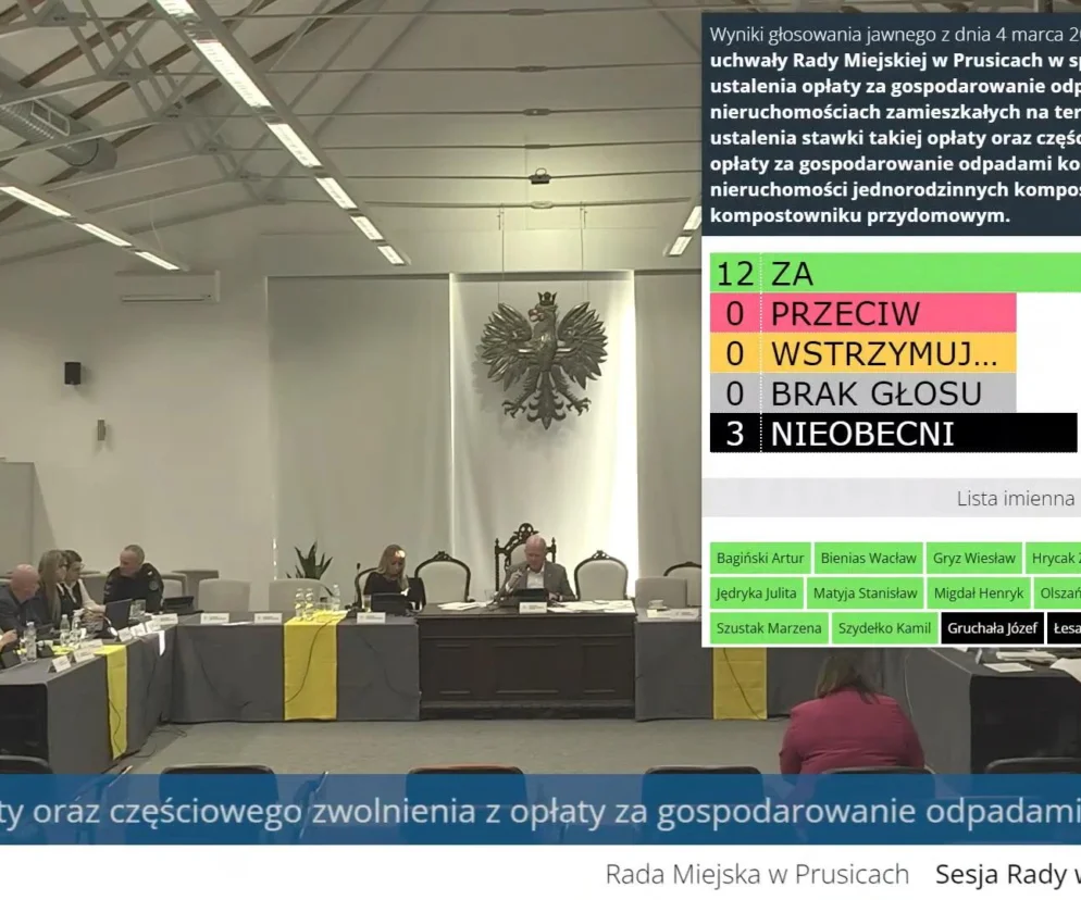 Argumenty przedstawione przez reprezentantkę Urzędu Miejskiego w Prusicach okazały się dla radnych wystarczające. "Za" poniesieniem opłat zagłosowano jednogłośnie, uchwałę poparło dwunastu obecnych na sesji radnych: Artur Bagiński, Wacław Bienias, Wiesław Gryz, Zbigniew Hrycak, Jarosław Jakubiak, Julita Jędryka, Stanisław Matyja, Henryk Migdał, Dorota Olszańska, Czesław Suchacki, Marzena Szustak oraz Kamil Szydełko. Nieobecni na sesji byli radni: Józef Gruchała, Janusz Łesak i Zbigniew Miszczuk.